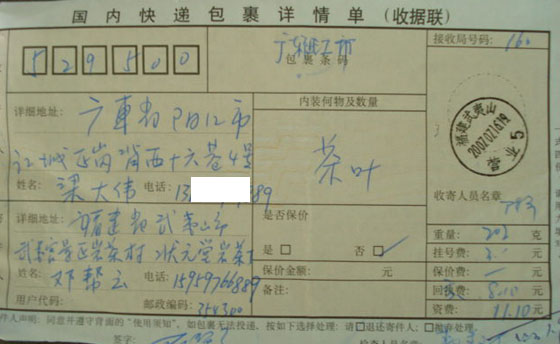 您的位置:  武夷山状元堂岩茶厂 -> 发货通知列表 -> 广东阳江梁先生:茶品已发!